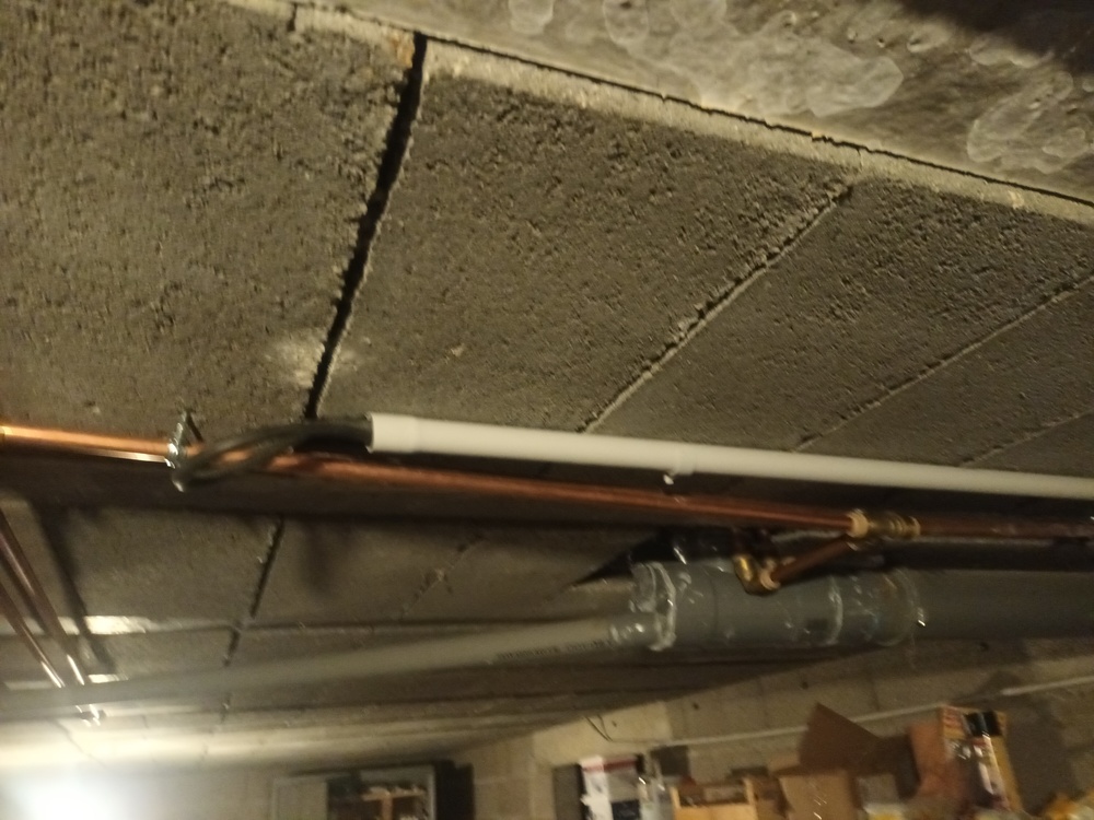 Armed with those, I got to work drilling holes in the concrete basement ceiling and setting up a few tubes. I fed a couple of cables into the tubes, finishing the path of the two cables I had started yesterday. I started on a new set of cables from the circuit breaker box.
