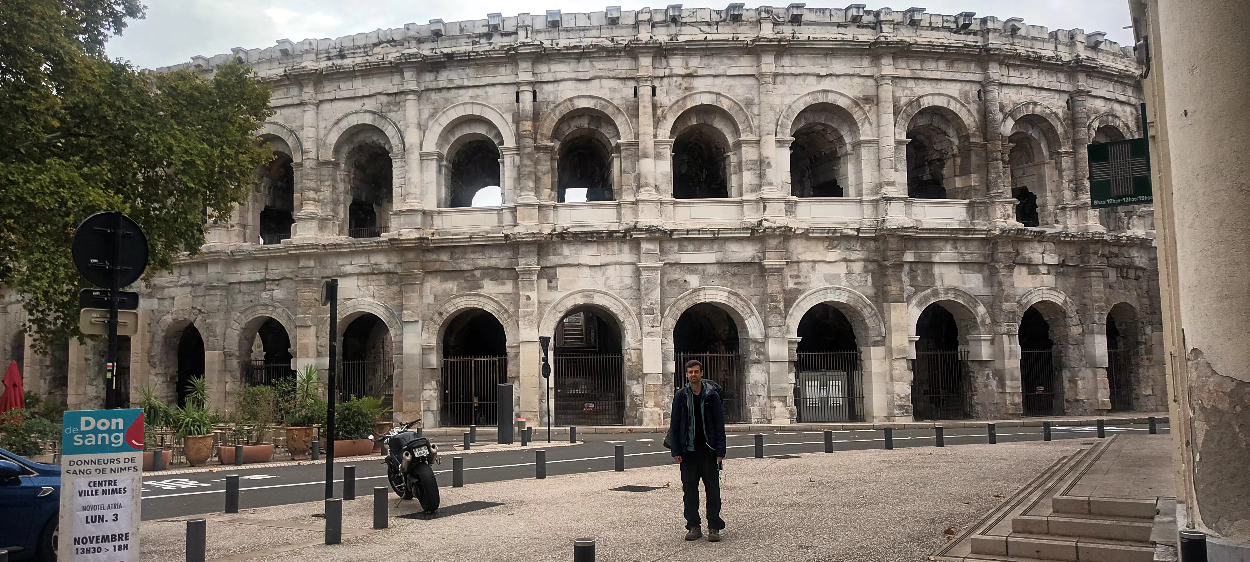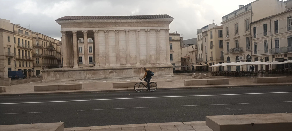 Soon enough we were out of the hills and entering the suburbs of Nîmes. There were some hills to deal with, as well as plenty of cars. Occasionally there was a raindrop, but the weather held off all morning for the most part.